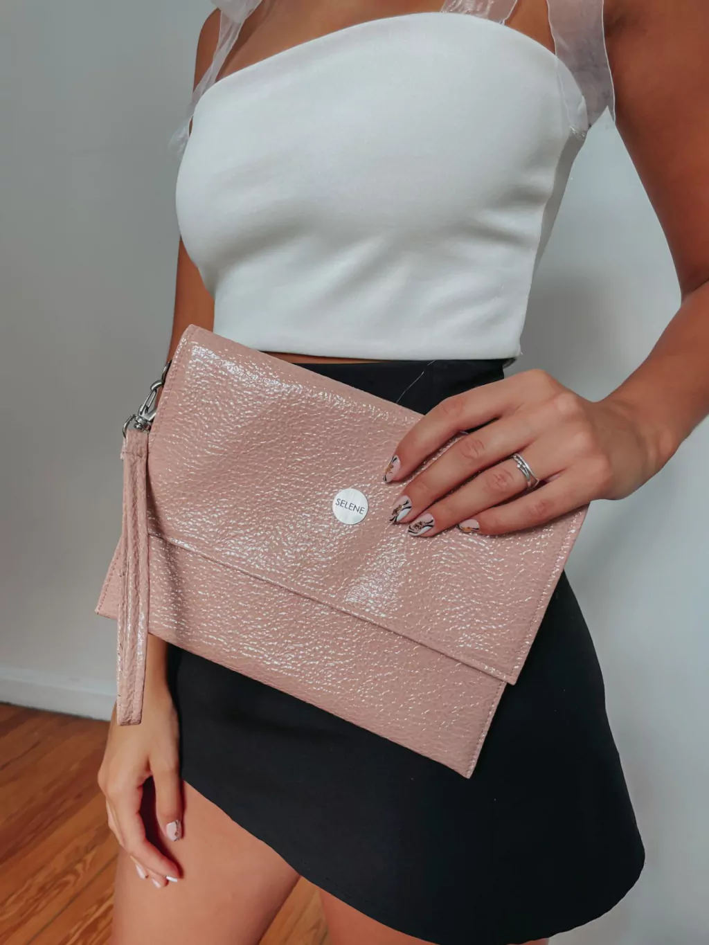 Realizado en ecocuero charolado con efecto tramado color rosa, con terminaciones impecables