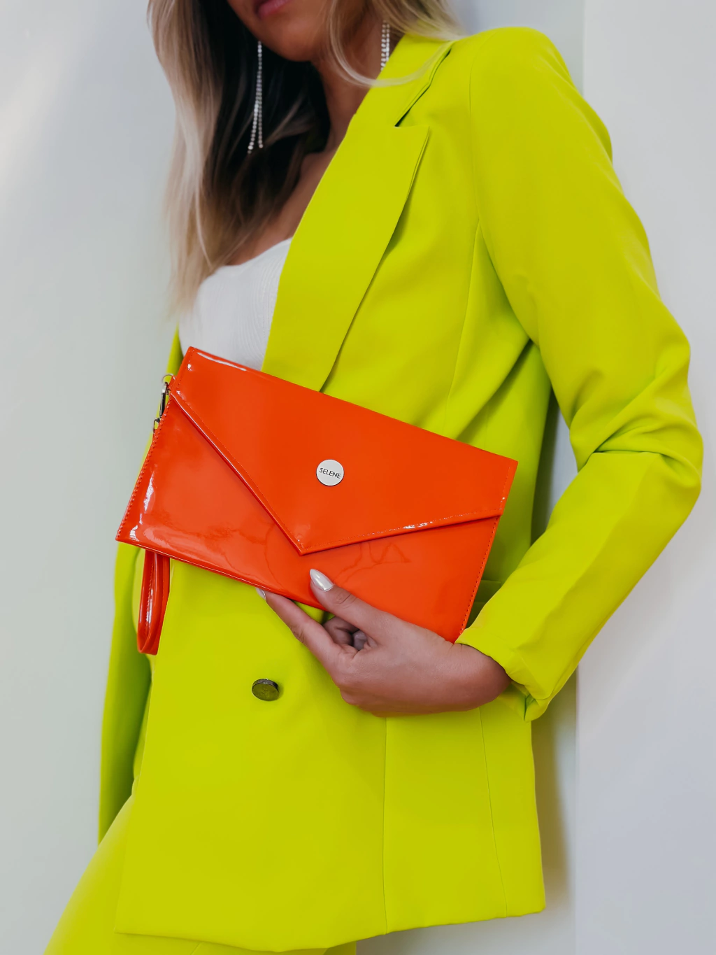 Perfecto para eventos, salidas de noche y ocasiones especiales. Asi es el sobre charol naranja. Es el accesorio que no te puede faltar para llevar lo esencial con estilo: celular, llaves, labial.